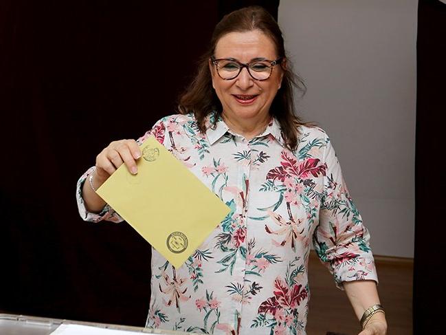 Ruhsar Pekcan, eşi Hasan Pekcan ile birlikte oy kullanacağı Şehit Er Ersin Güner Ortaokulu'na geldi.