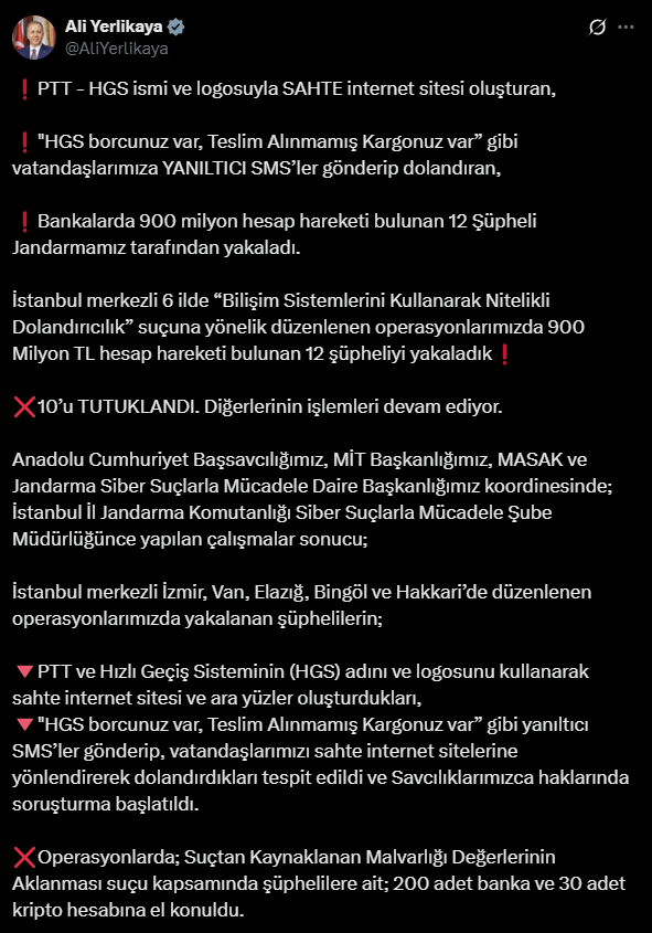 Şüphelilerin, PTT ve HGS logosunu kullanarak sahte siteler kurdukları, vatandaşlara “HGS borcunuz var” ve “Teslim alınmamış kargonuz var” şeklinde mesajlar gönderip dolandırıcılık yaptıkları belirlendi. Bu yöntemle birçok kişiyi kandıran 12 şüpheli jandarma tarafından gözaltına alındı.