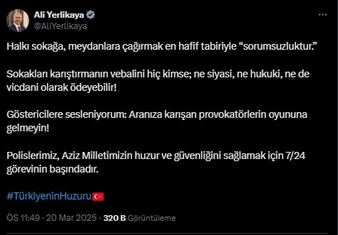 Bakan Yerlikaya akşam saatlerinde bir X paylaşımı daha yaptı. CHP lideri Özgür Özel'in 'Sokağa çağrı yapıyorum' dediği konuşmasının ardından Yerlikaya şu ifadeleri kullandı: