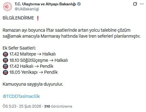 "Ramazan ayı boyunca iftar saatlerinde artan yolcu talebine çözüm sağlamak amacıyla Marmaray hattında ilave tren seferleri planlanmıştır.