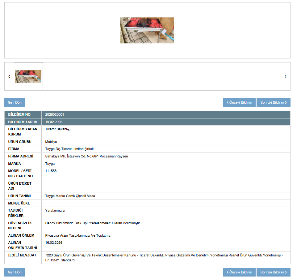 Listede yer alan ürünlerden biri “Tayga Marka Camlı Çiçekli Masa” (Model No: 111558), diğeri ise “Tayga Marka Ahşap Masa” (Model No: 111559) olarak açıklandı.