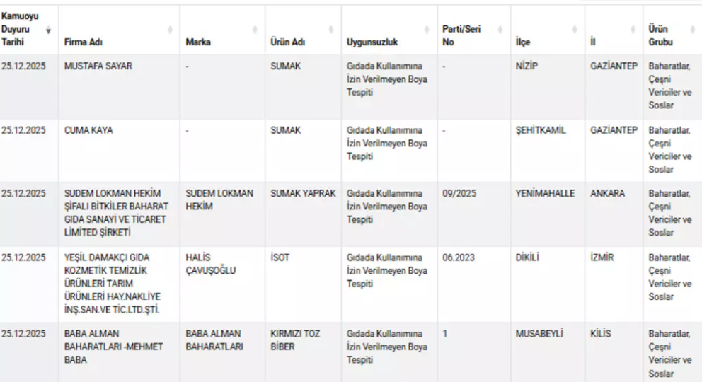 Bakanlığın açıkladığı son denetim sonuçlarına göre, bazı baharat ürünlerinde gıdada kullanımına izin verilmeyen boya maddelerinin kullanıldığı belirlendi. Uzmanlar, bu tür boyaların uzun vadede ciddi sağlık sorunlarına yol açabileceği uyarısında bulunuyor.