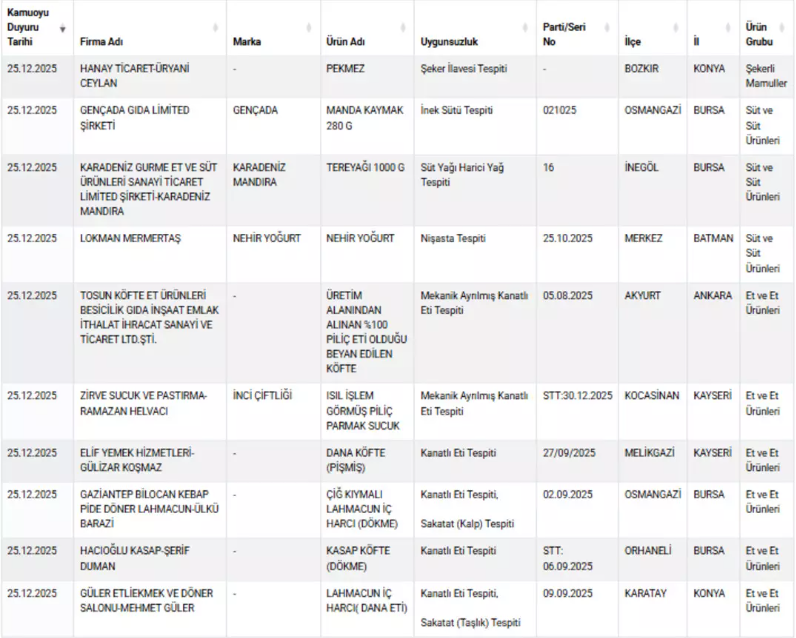 Tarım ve Orman Bakanlığı, gıda güvenliğini sağlamak amacıyla yürüttüğü denetimlerini sürdürüyor. Yapılan kontrollerde mevzuata aykırı üretim yapan ve gıdada taklit-tağşiş uyguladığı belirlenen firmalar, Bakanlığın resmi internet sitesi üzerinden kamuoyuna duyuruluyor.