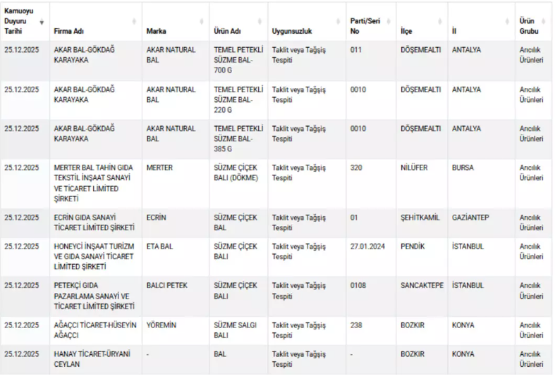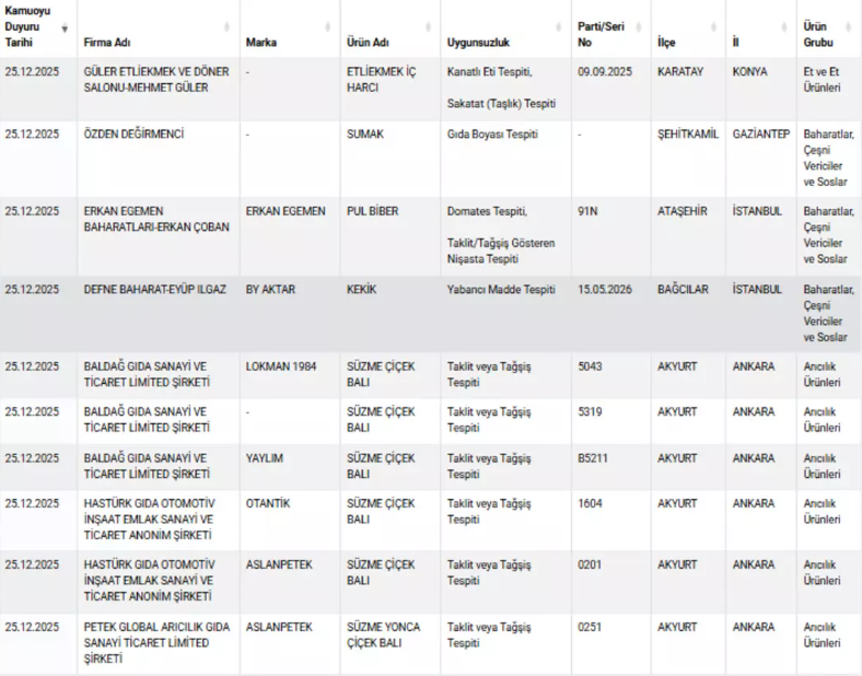 Son yayımlanan listede; baharat, bal, et ve süt ürünleri başta olmak üzere onlarca ürün yer aldı. Sağlığı tehlikeye düşürebilecek uygulamalar nedeniyle pek çok marka bir kez daha gündeme geldi.