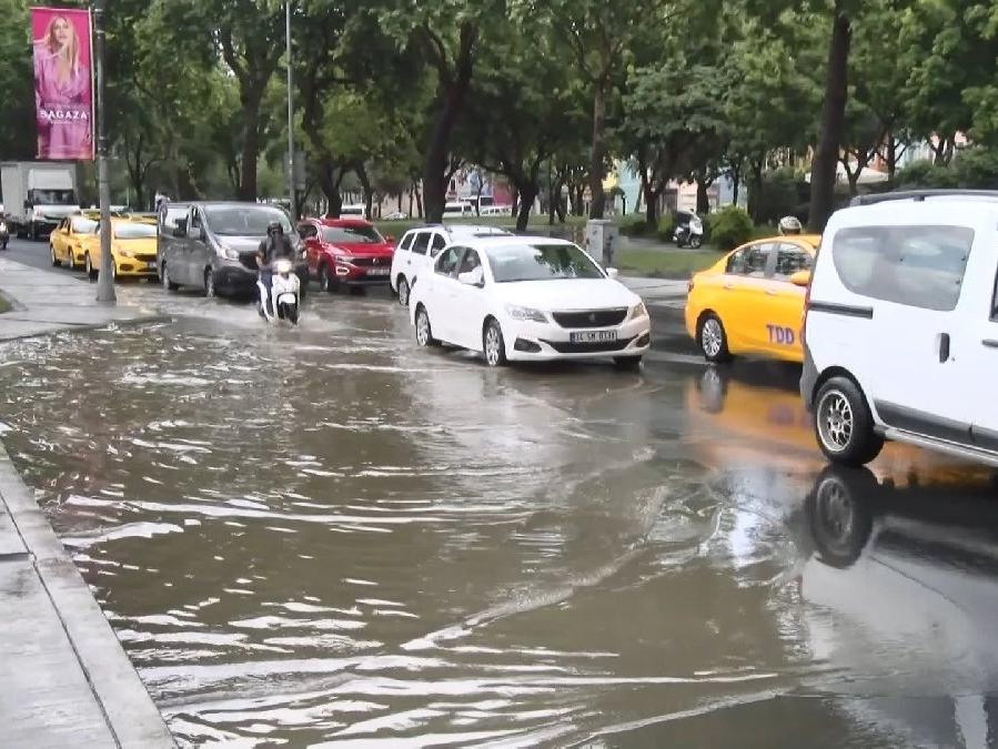 Tramvay istasyonunun hemen yanındaki trafik ışıklarından yolun karşısına geçmek isteyenler ıslanmaktan kurtulamadı. Caddede asfaltlama çalışması sırasında bastıran yağmur nedeniyle rögar kapaklarının yüksekte kaldığı ve suyun tahliye olmadığı belirtildi. (DHA)