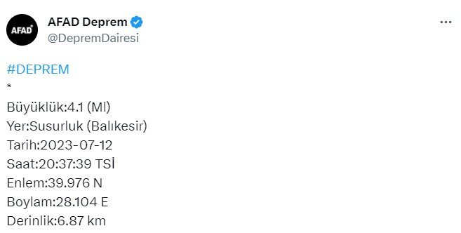 Afet ve Acil Durum Yönetimi Başkanlığı'ndan (AFAD) yapılan açıklamada, saat 20.37'de merkez üssü Balıkesir'in Susurluk ilçesinde Riçhter ölçeğine göre 4.1 büyüklüğünde deprem meydana geldi.