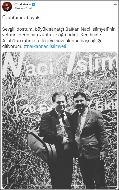 Keman virtüözü Cihat Aşkın da sosyal medya hesabından bir paylaşım yaparak, "Üzüntümüz büyük. Sevgili dostum, büyük sanatçı Balkan Naci İslimyeli’nin vefatını derin bir üzüntü ile öğrendim. Kendisine Allah’tan rahmet ailesi ve sevenlerine başsağlığı diliyorum" yazdı.