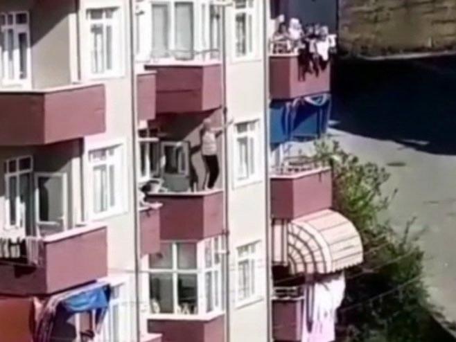 Çalan müziğe kendini kaptıran bir vatandaş ise tehlikeli hareketleriyle dikkat çekti. Balkon duvarına çıkan ve ismi öğrenilemeyen vatandaş müzik eşliğinde oynamaya başladı.