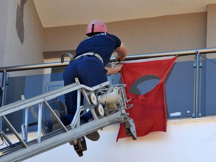 Balkondaki ay ve yıldızı kesilmiş bayrağı itfaiye indirdi