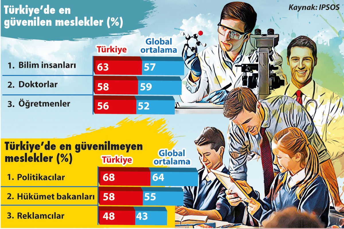 Politikacılara güven sadece yüzde 14. Yargıçlara güven yüzde 29 ile, askerlere güven de yüzde 39 ile global ortalamanın gerisinde. Türkiye’de polislere olan güven ise yüzde 42 ile global ortalama olan yüzde 37’nin üzerinde. Ipsos’un yaptığı global araştırmaya göre Türkiye’de doktorlara olan güvende 11 puanlık düşüş var. Bu meslek global ortalamada güvende ilk sırada iken Türkiye’de yüzde 58’lik güven oranı ile, yüzde 63’ün güvendiği bilim insanlarından sonra ikinci sıraya gerilemiş durumda. Üçüncü sırada ise öğretmenler var.