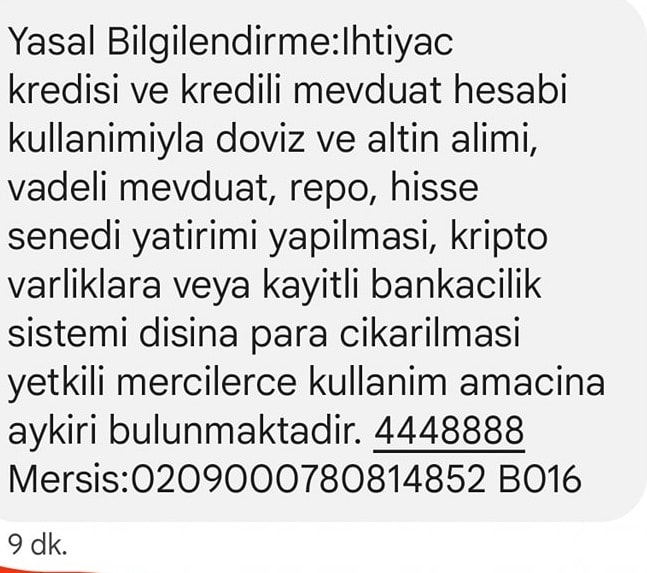 Bankalar tarafından kart sahiplerine gönderilen mesajda, "İhtiyaç kredisi ve kredili mevduat hesabı kullanımıyla döviz ve altın alımı, vadeli mevduat, repo, hisse senedi yatırımı yapılması, kripto varlıklara veya kayıtlı bankacılık sistemi dışına para çıkarılması yetkili mercilerce kullanım amacına aykırı bulunmaktadır" ifadelerine yer verildi.