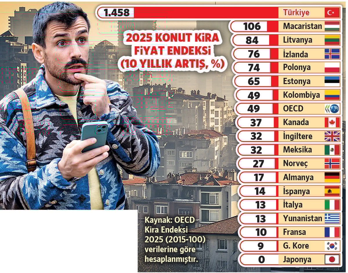 OECD 2025 Konut Kira Fiyat Endeksi’ne göre, Türkiye’de kira endeksi 2025 itibarıyla 1.558 seviyesine yükseldi. Türkiye, 2015 yılından bu yana kiralardaki 15 kat (yüzde 1.458) artışla açık ara zirveye yerleşti. Bu oran, 10 yılda yüzde 106 ile kiraların en çok arttığı ikinci ülke olan Macaristan’ın 14 katına denk geldi. 10 yıllık kira artışında Litvanya (yüzde 84), İzlanda (yüzde 76), Polonya (yüzde 74) ve Estonya (yüzde 65) Türkiye’yi uzaktan takip etti. Avrupa’nın güneyinde yer alan Yunanistan’da kira artışı yüzde 13 ile sınırlı kaldı. Yunanistan, İtalya (yüzde 13) ve İspanya (yüzde 14) ile aynı bantta yer alırken; Fransa (yüzde 10) ve Almanya (yüzde 17) gibi büyük ekonomilerde de artışlar görece düşük seviyelerde gerçekleşti.