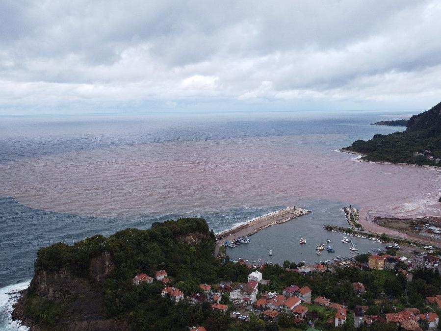 Bartın'ın Kurucaşile ilçesinde sağanak nedeniyle dereler taştı, çamurlu suyun aktığı denizin rengi değişti.