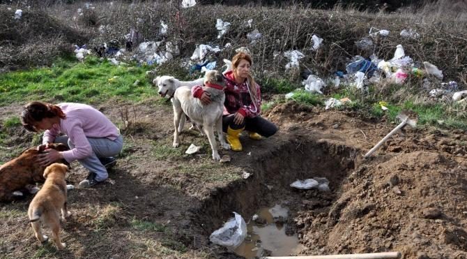 BARTIN'da oturan hayvanseverler Sevim Arkan, Ayşe Kök ve Uğurcan Saban, sokak hayvanlarına şiddete dikkat çekmek için 6 gün önce başlattıkları açlık grevini sürdürürken kendi mezarlarını kazmaya başladı.