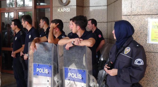Bayraklı Adliyesi'nde alınan güvenlik tedbirleri kapsamında, Emniyet Müdürlüğü Çevik Kuvvet Şube Müdürlüğü'nde görevli adını açıklamayan başörtülü kadın komiser dikkati çekti. Başörtülü kadın komiser, elinde telsizle adliyeyinin etrafını dolaşıp, kendisine bağlı olan timi yönlendirdi.