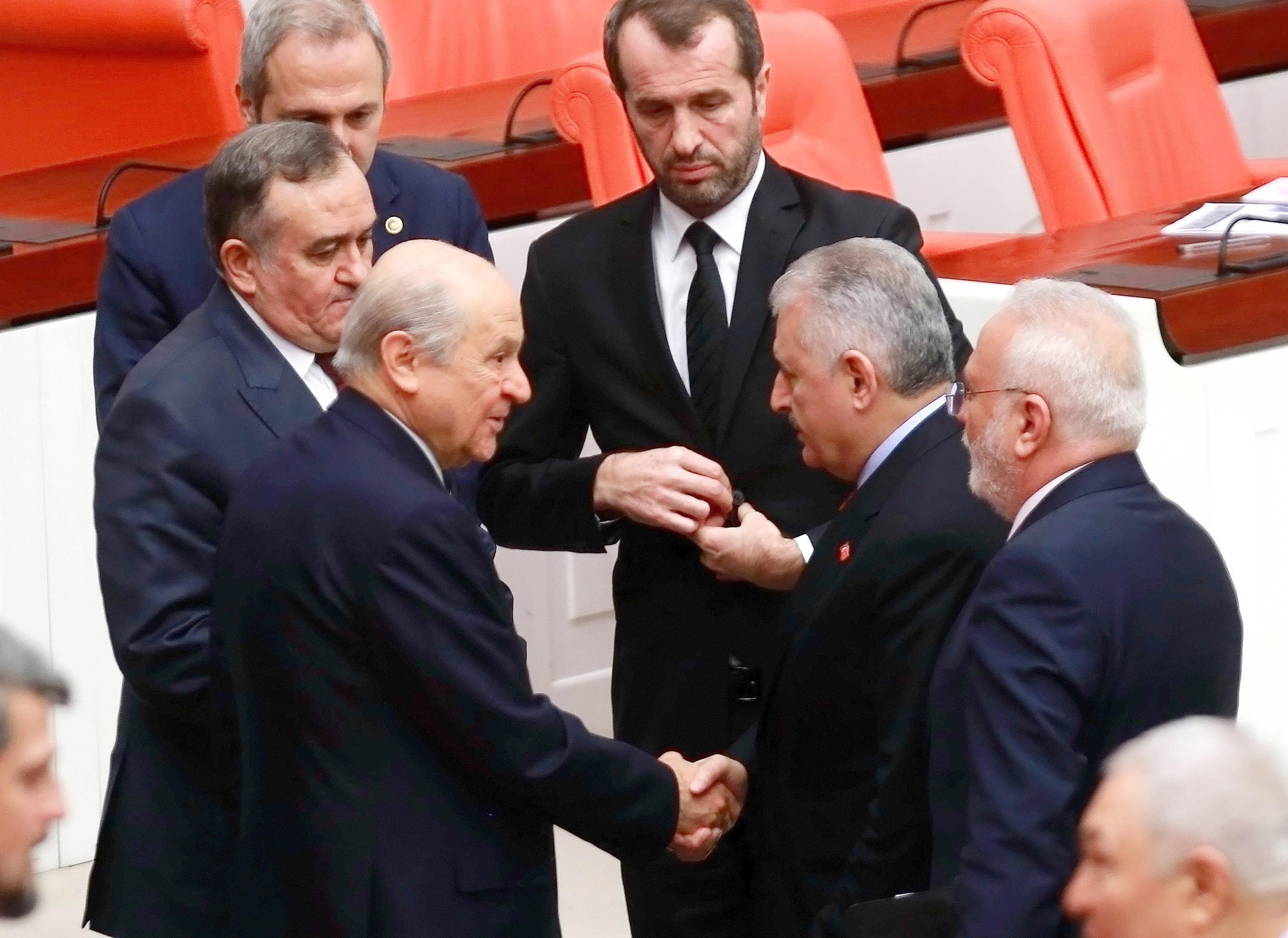 TBMM Genel Kurulu'nda, AK Parti'nin anayasa değişiklik teklifinin maddelerine geçilmesinin, 338 oyla kabul edilmesinin ardından Başbakan Binali Yıldırım, oturduğu AK Parti sıralarından MHP Genel Başkanı Devlet Bahçeli’nin Genel Kurul salonundaki grup sırasında oturduğu yere giderek, MHP Lideri'ne teşekkür etti. Yıldırım ve Bahçeli, tokalaşmalarının ardından bir süre sohbet etti.