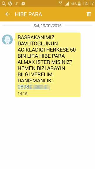 AKP’nin seçim öncesinde vaat ettiği iş kurmak isteyen gençlere verilecek olan 50 bin TL’lik hibe dolandırıcıların yeni yöntemi oldu. Cep telefonlarına “Başbakanımız Davutoğlu’nun açıkladığı herkese 50 bin lira hibe para almak ister misiniz? Hemen bizi arayın” mesajı gönderiliyor. Paylaşılan telefon numarası “0898” ile başlıyor. Arama yapıldıktan sonra çıkan operatör aramanın “700 kuruş” olarak ücretlendirildiğini belirtiyor.
