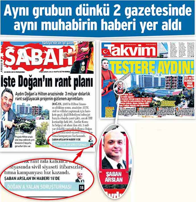 Sabah ve Takvim gazeteleri dün, Aydın Doğan’ın Hilton arazisiyle ilgili iddialara ilişkin ortak haberle çıktı. Haberde aynı muhabirin fotoğraflı imzası yer aldı. SÖZCÜ Grubu bünyesindeki Korkusuz’a, “Ortak imza var” diyerek ilan ambargosu uygulayan Basın İlan Kurumu, bu iki yandaş gazeteye ise dün ayrı ayrı binlerce liralık kamu ilanı verdi.