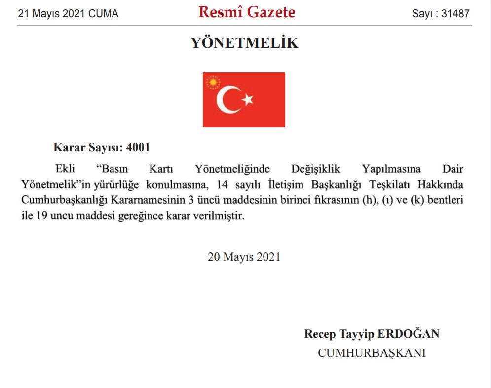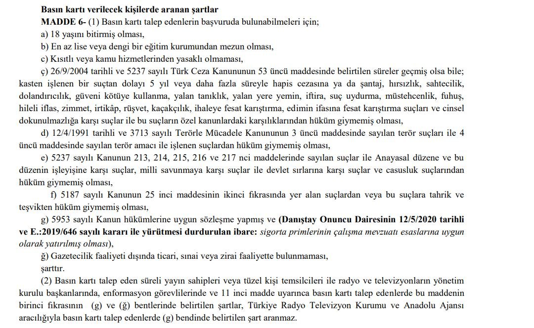 Yeni düzenlemeyle, "Basın Kartı" verilecek kişilerde aranan şartlara, "suç işlemek amacıyla örgüt kurmak, üyesi olmak veya yardım etmekten hüküm giymemiş olmak" ibaresi eklendi.