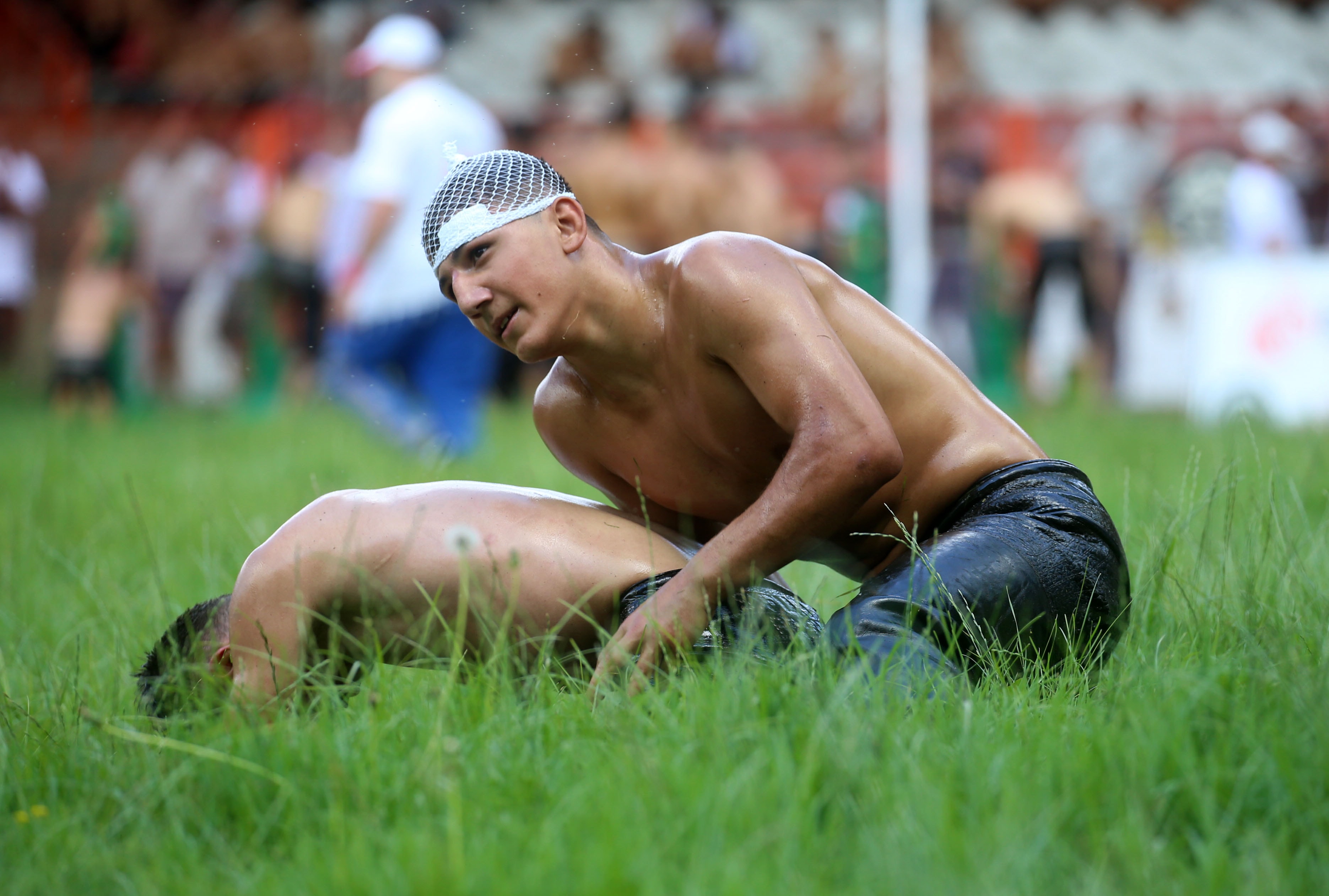 663. Tarihi Kırkpınar Yağlı Güreşleri'nde Teşvik-2 boyda mücadele eden Volkan Bilgin, başında beş dikiş olmasına rağmen rakibini 1 dakikada yenmeyi başardı.