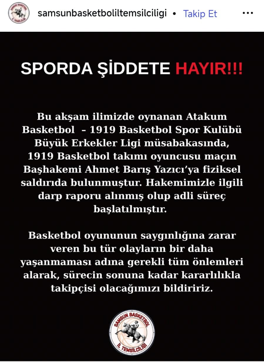 Samsun Basketbol İl Temsilciliği, yaşanan olayla ilgili yazılı açıklama yaptı. Açıklamada, “Bu akşam ilimizde oynanan Atakum Basketbol–1919 Basketbol Spor Kulübü Büyük Erkekler Ligi müsabakasında, 1919 Basketbol takımı oyuncusu, maçın başhakemi Ahmet Barış Yazıcı'ya fiziksel saldırıda bulunmuştur.