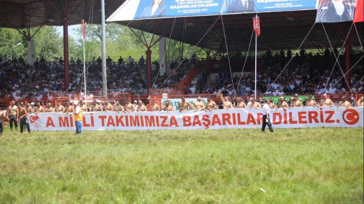 Baş boyunda güreşecek pehlivanlar, seyirciye takdim edildi, pehlivanlar aynı zamanda "A Milli Takımımıza başarılar dileriz" pankartı da açtı. Bu sırada güreşecek tüm başpehlivanlar, "bozkurt" işareti yaptı.