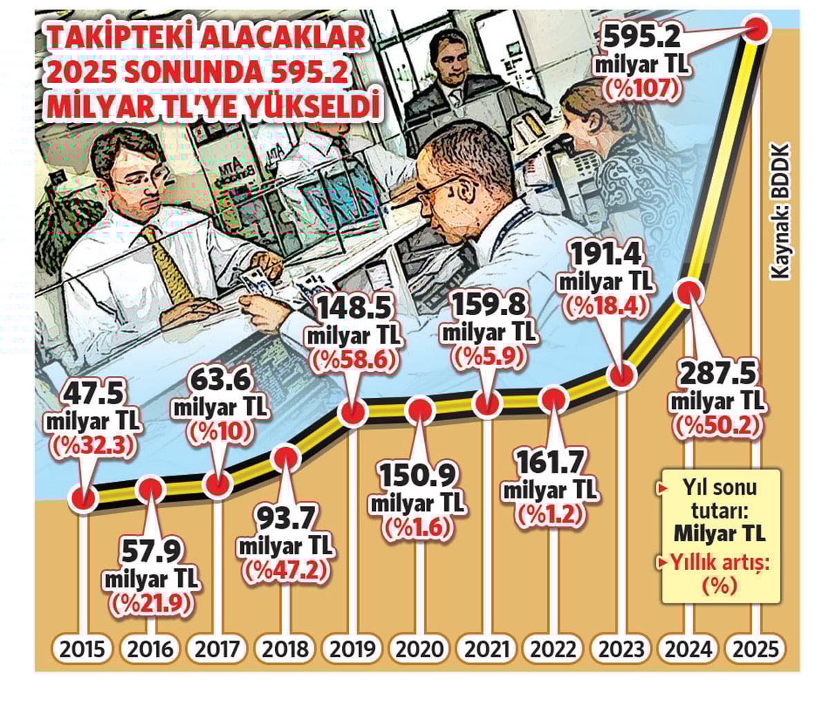 2025’te ticari ve diğer kredilerde takipteki alacaklar 176.7 milyar TL’den 352.5 milyar TL’ye çıkarak yüzde 99.5 arttı. Tüketici kredilerinde batık tutarı 57 milyar TL’den 117.5 milyar TL’ye yükseldi; yıllık artış