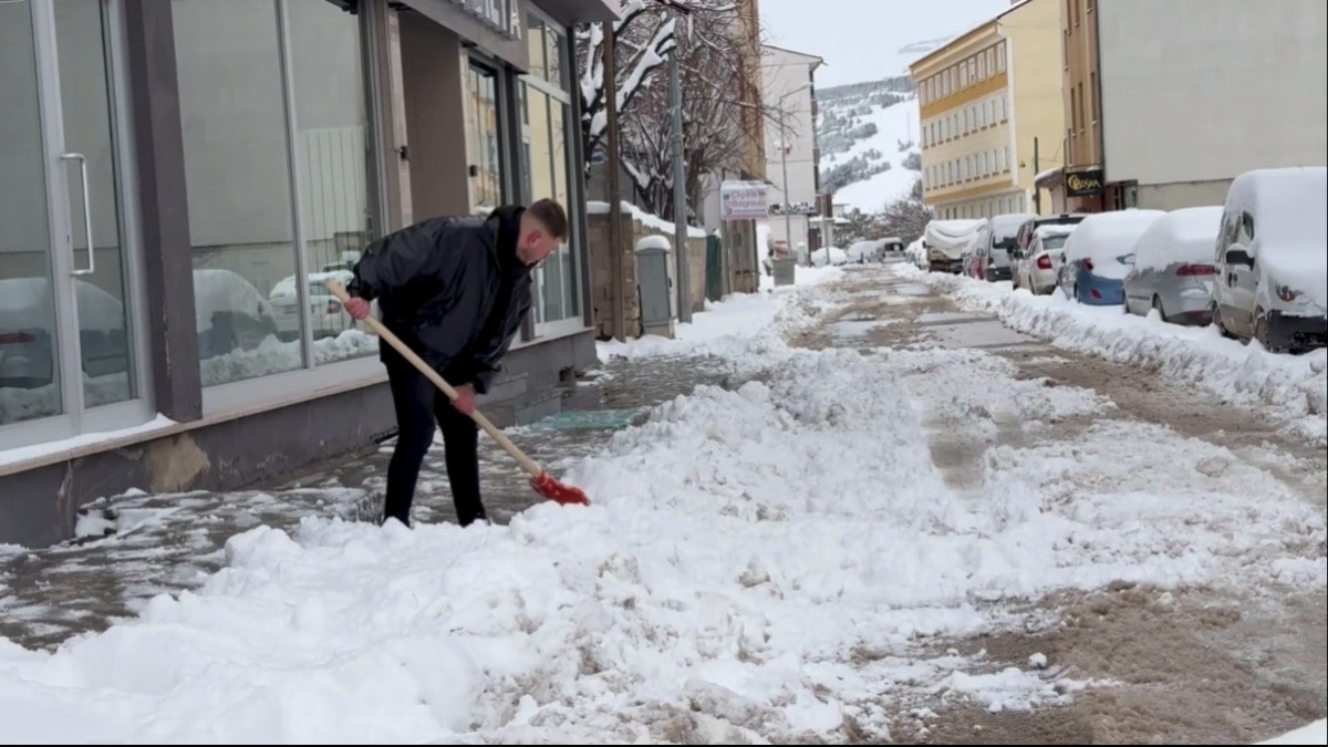 Belediye ekiplerinin yol temizleme çalışmaları devam ederken, sabah saatlerinde iş yerlerini açan esnaf ise dükkanlarının önündeki kar birikintilerini temizledi.