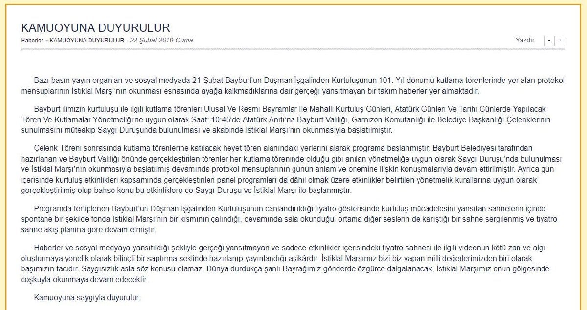 Bayburt Valiliği yaşanan durum hakkında yazılı bir basın açıklaması yayınladı. Görüntülerin gerçeği yansıtmadığı belirtilen açıklamada, sahnelenen oyunda İstiklal Marşı’nın bir bölümünün çalındığı belirtildi. Saygısızlığın asla söz konusu olamayacağı vurgulanan açıklamada şu ifadeler yer aldı: