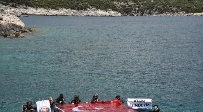 İstanbul Beylikdüzü Sualtı Sporları Dünya Rekortmenler Kulübü'nden bir grup dalgıç, dalış yapmak için Demre'nin Kekova Bölgesi'ne geldi. Sualtında tüplü olarak en uzun süre kalma dünya rekortmeni olan Cem Karabay'ın da aralarında bulunduğu grup, yatla Gökkaya Koyu'na geçti. Önce su yüzeyinde dev bir Türk bayrağı açan dalgıçlar, 'Ne mutlu Türküm diyene' sloganı attı. Daha sonra sualtına inen dalgıçlar, burada da dev Türk bayrağının yanında, 'Yurtta sulh cihanda sulh' yazılı Atatürk posteri ve 'Atam izindeyiz' pankartı açtı.
