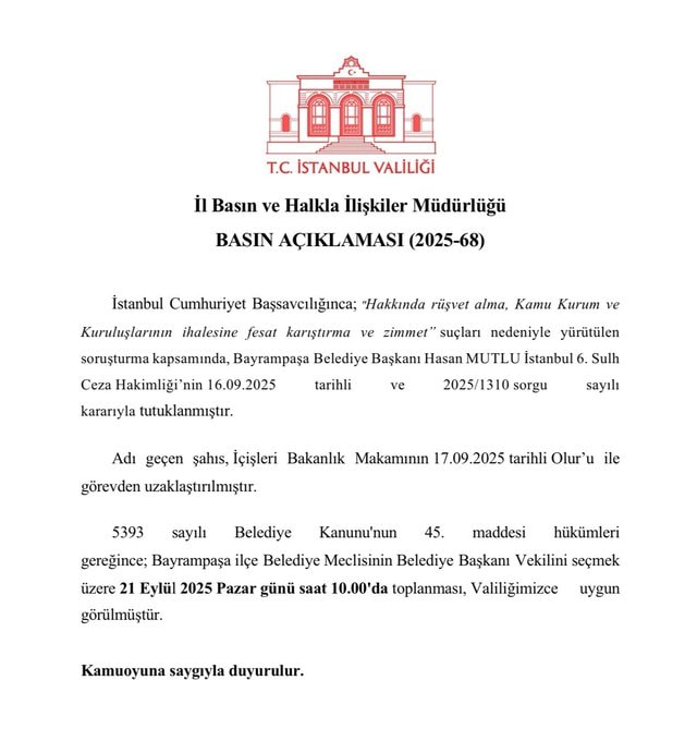 İstanbul Valiliği tarafından yapılan açıklamada Mutlu'nun tutuklandığı ve görevden alındığı anımsatılırken belediyede başkanvekili seçimi için tarihi de açıklandı.