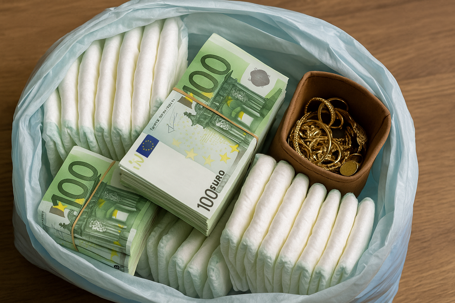 Temizlik şirketi, Köln'e taşınan bir kadının Bavyera’daki dairesini boşaltmakla görevlendirildi. Çalışmalar sırasında evde saklanmış şekilde 600.000 Euro’dan fazla nakit para (26.978.520,00 Türk Lirası) ayrıca yaklaşık 30.000 Euro değerinde mücevher ve madeni para bulundu. İlginç olan ise, paraların bebek bezi paketlerine ve bir bavul içerisine gizlenmiş olmasıydı. Üstelik bodrumda 66.500 Euro daha ortaya çıktı.