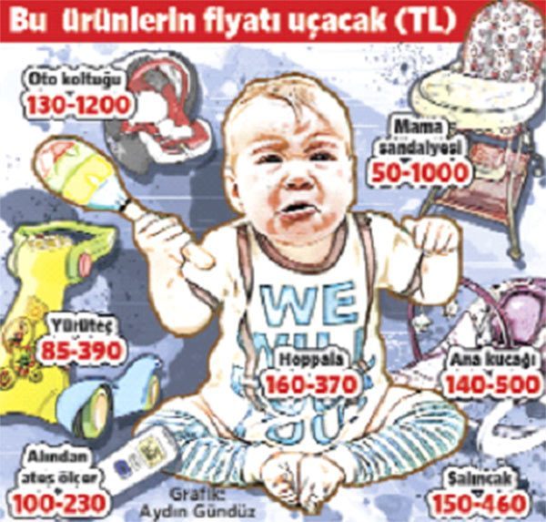 Mehtap Ö. ERTÜRK- Yürüteçten oto koltuğuna, hoppaladan mama ısıtıcısına, ateş ölçerden ana sterilizatöre kadar bir bebeğin bakımında gerekli olan birçok ürüne büyük zam kapıda. 23 Mayıs 2015 tarihinde Resmi Gazete’de yayımlanarak yürürlüğe giren Bakanlar Kurulu’nun ‘İthalat Rejimi Kararına Ek Kararı’ ile ithal edilen bebek araç ve gereçlerine ilave gümrük vergisi oranı yeniden belirlendi. Buna göre, ilave gümrük vergisi oranı bebek araç ve gereçlerinde yüzde 50, aksam ve yedek parçalar içinse yüzde 25 olarak belirlendi.