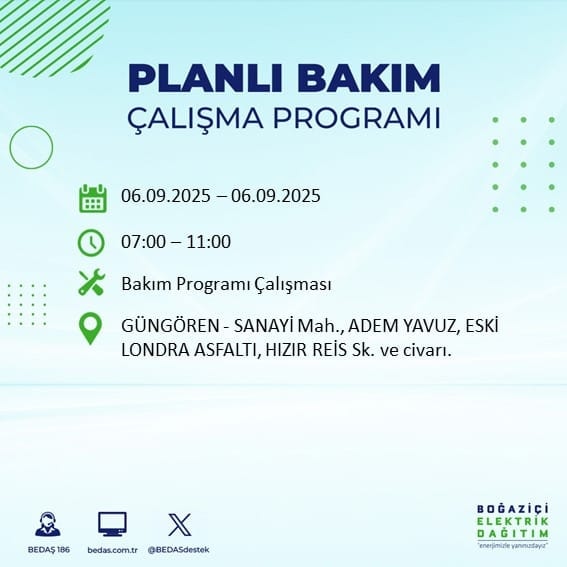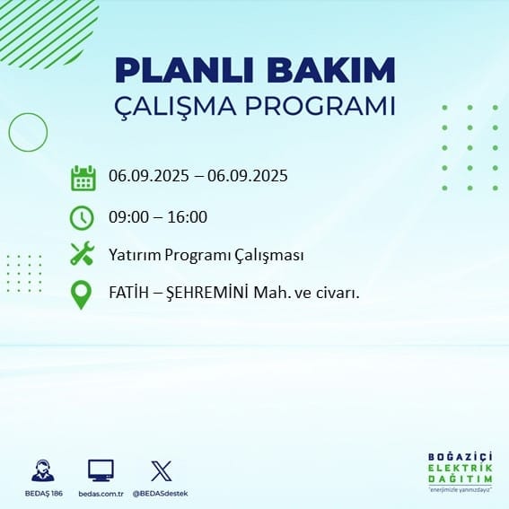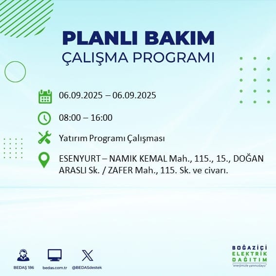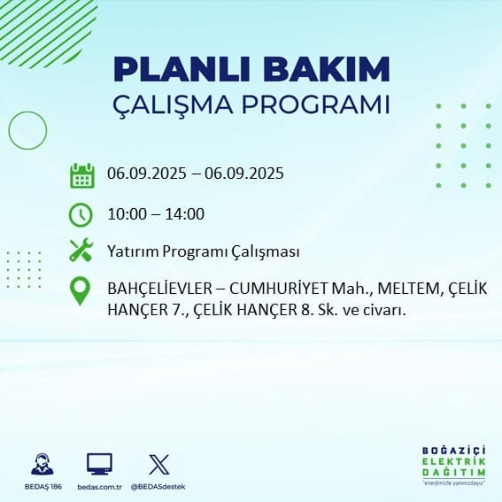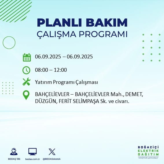 BEDAŞ, resmi internet sitesi üzerinden yaptığı duyuruda, elektrik şebekesinin güvenli ve verimli çalışmasını sağlamak amacıyla planlı bakım, onarım ve yatırım çalışmaları yapıldığını belirtti. Kesintilerin süresi ve etkilenecek bölgeler, çalışma programına göre farklılık gösteriyor.