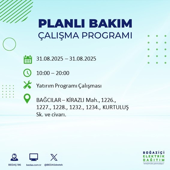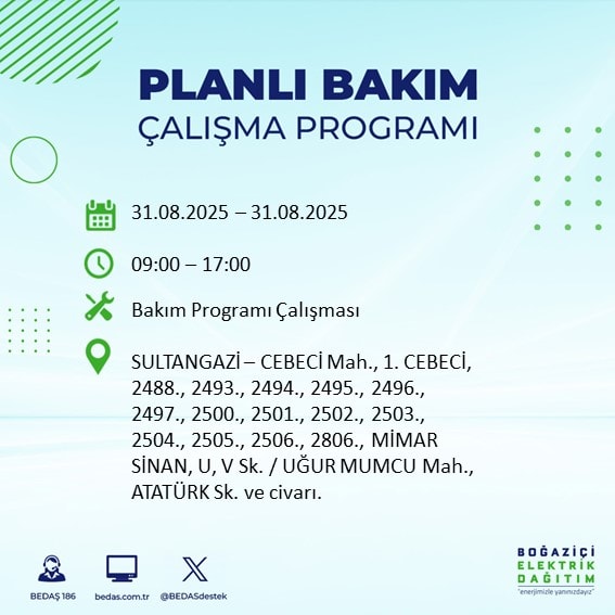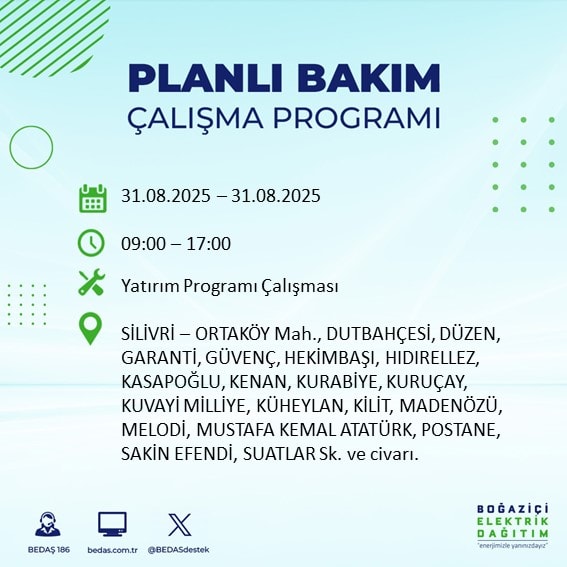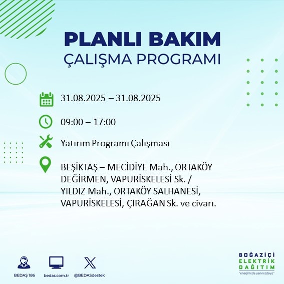 İstanbul'da elektrik dağıtım işlerini yürüten BEDAŞ yaptığı açıklamada elektrik kesintisi yaşanacak ilçe, mahalle ve sokakları açıkladı.