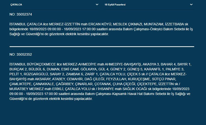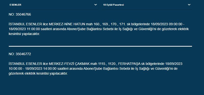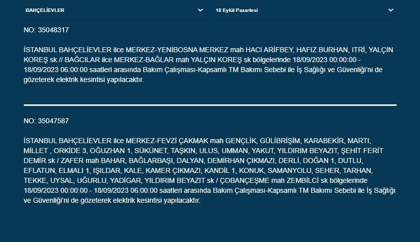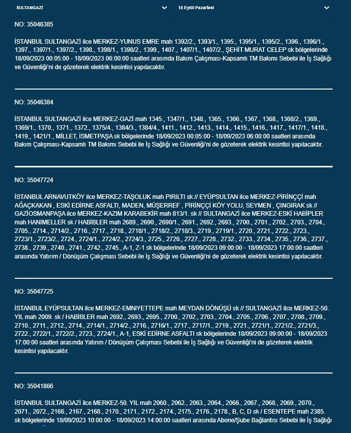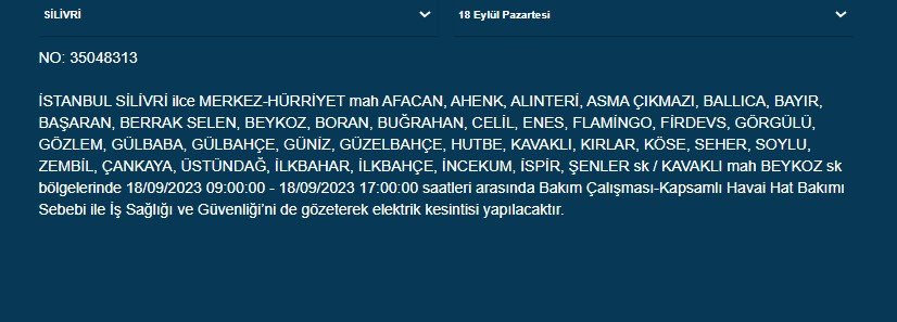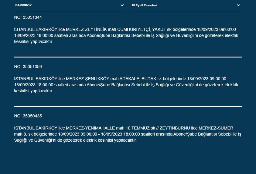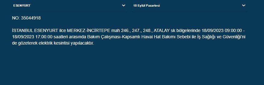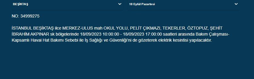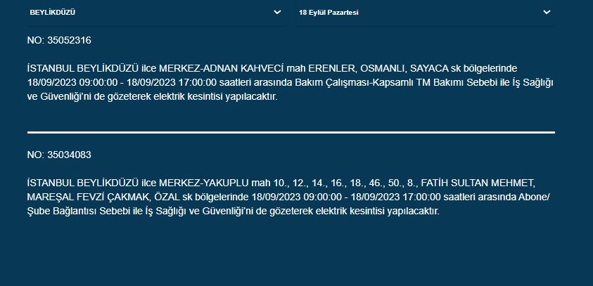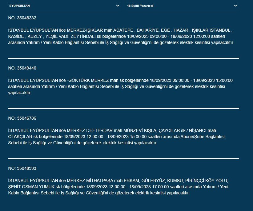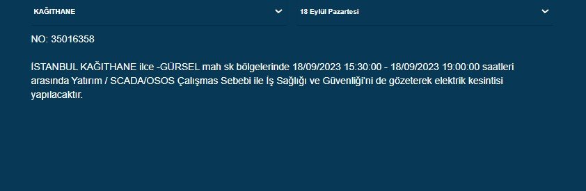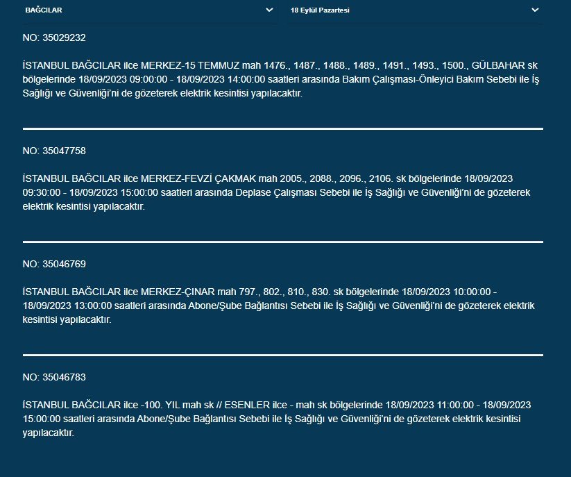 BEDAŞ'tan yapılan açıklamaya göre 18 Eylül Pazartesi günü İstanbul'un 19 ilçesinde elektrik kesintisi yaşanacak. İşte saat saat elektrik kesintileri...