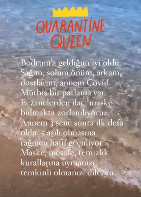 41 yaşındaki oyuncu, "Bodrum'a geldiğim iyi oldu. Sağım, solum, önüm, arkam, dostlarım, annem Covid. Müthiş bir patlama var. Eczanelerde ilaç, maske bulmakta zorlanıyoruz. Annem 3 sene sonra ilk defa oldu. 5 aşılı olmasına rağmen hafif geçmiyor. Maske, mesafe, temizlik kurallarına uymanızı, temkinli olmanızı dilerim" ifadesini kullandı.