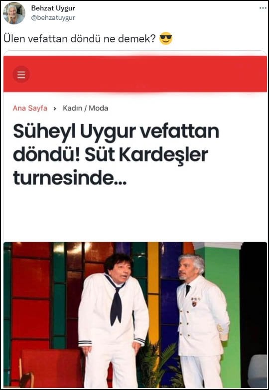Oyuncu Behzat Uygur, Karadeniz turnesinde kaza atlatan 'Süt Kardeşler' ekibinin haberini "Süheyl Uygur vefattan döndü" ifadeleriyle yapan bir internet sitesine esprili bir yanıt verdi.