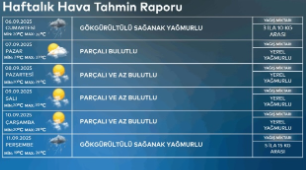 Meteoroloji Genel Müdürlüğü verilerine göre, ülkenin kuzey, iç ve batı kesimleri parçalı bulutlu, Marmara’nın doğusu, İç Ege, Batı Akdeniz, İç Anadolu’nun kuzeyi, Batı ve Orta Karadeniz ile Doğu Karadeniz kıyılarında sağanak ve gök gürültülü sağanak yağışlı olacak. Diğer bölgelerde ise hava az bulutlu ve açık geçecek.