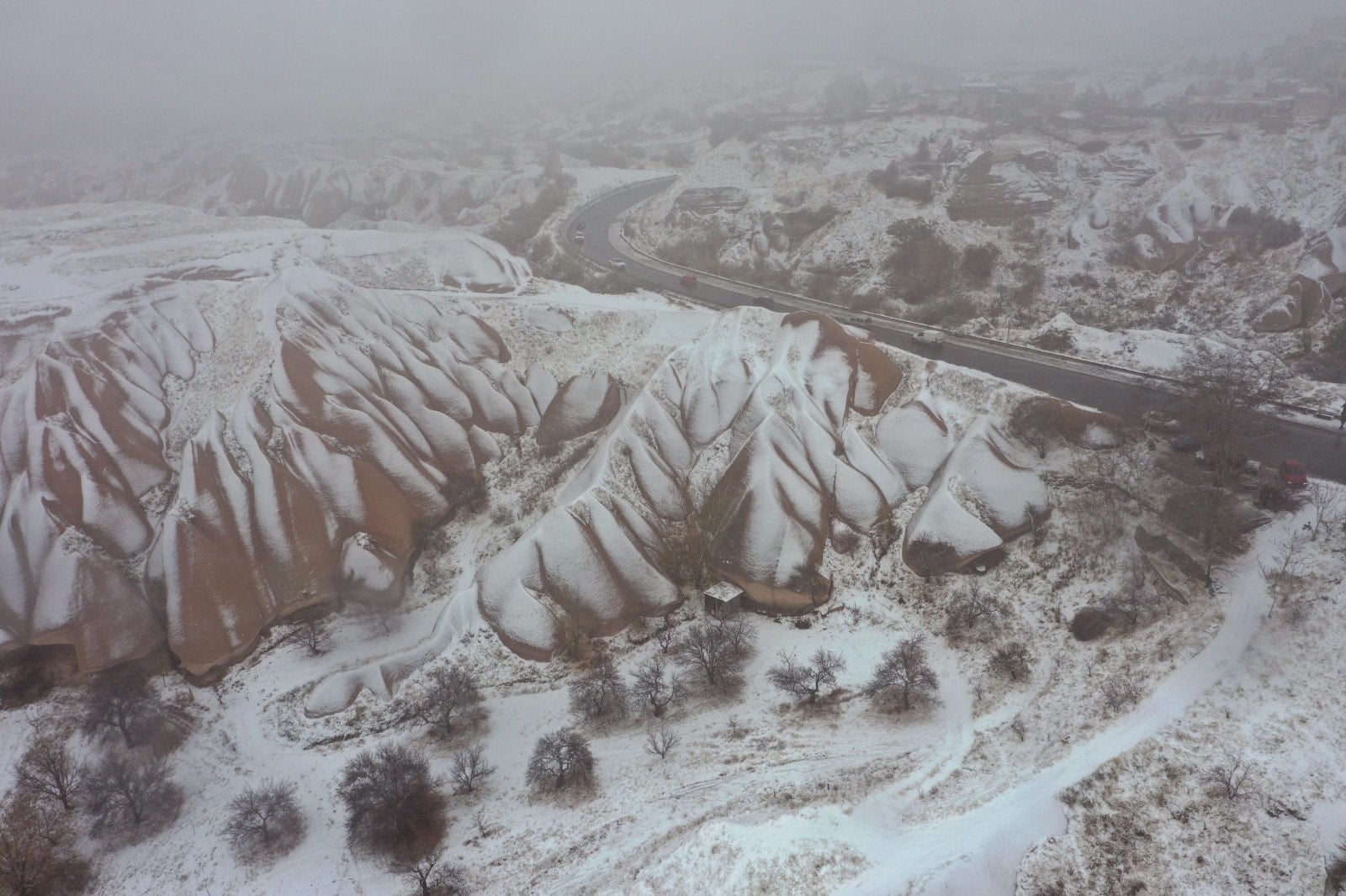Türkiye'nin tarihi, kültürel ve doğal güzellikleriyle bezeli turizm bölgesi Kapadokya'da, mevsimin ilk karı peribacalarıyla kaplı vadilerde masalsı manzara oluşturdu.
