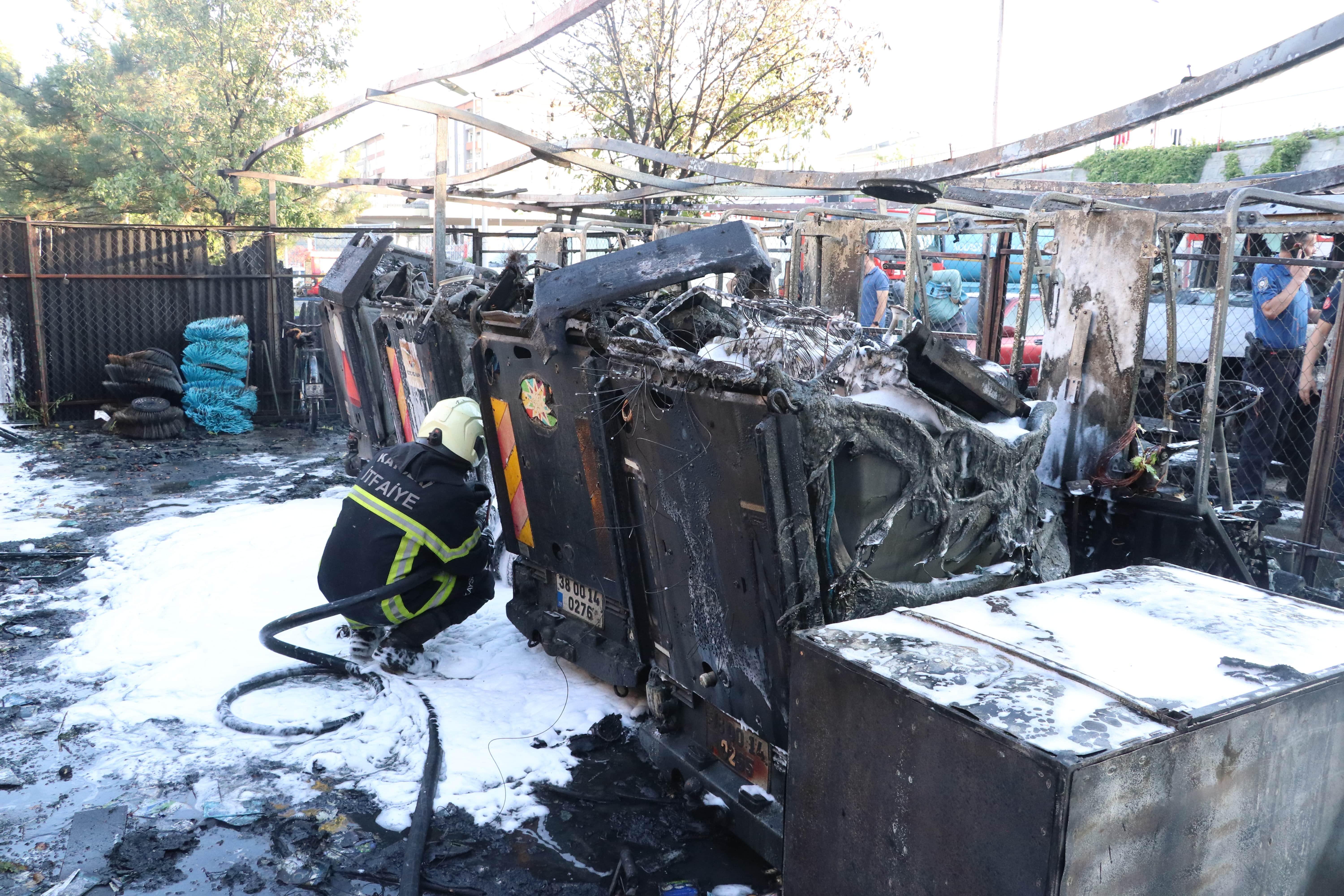 Yangında belediyenin temizlik işlerinde kullanılan 7 aracı ile bir minibüs kullanılmaz hale geldi.