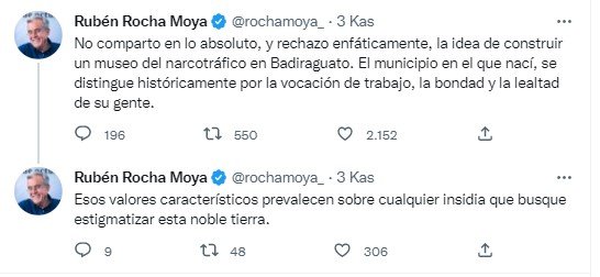 Sosyal medya üzerinden açıklama yapan Vali Moya, "Badiraguato'da bir uyuşturucu kaçakçılığı müzesi inşa edilmesi fikrine hiç katılmıyorum ve kesinlikle reddediyorum. Doğduğum belediye, tarihsel olarak halkının çalışkanlığı, nezaketi ve sadakatiyle öne çıkmıştır. Bu karakteristik değerler, bu asil toprakları damgalamaya çalışan her türlü sinsiliğe üstün gelir" ifadelerini kullandı.