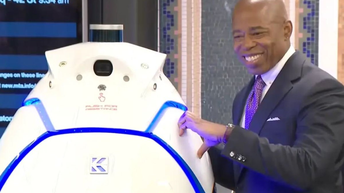 Pilot program kapsamında Times Meydanı'ndaki metro durağında iki ay boyunca kullanılacak kolsuz devriye robotunu tanıtan Adams, basın mensuplarının sorularını yanıtladıktan sonra robot ile poz verdi. Son haftalarda sıklıkla kullandığı "eliyle kalp işareti" yapmaya çalışan Adams, sosyal medya kullanıcılarının dikkatini çekti.