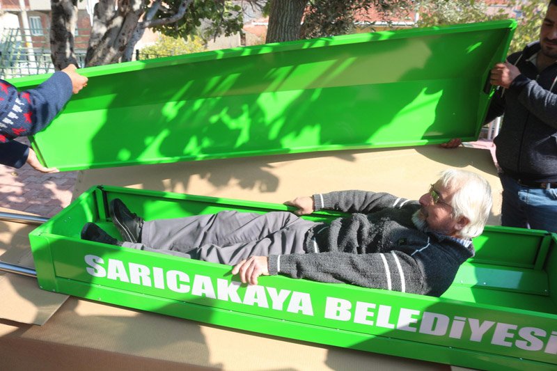 Eskişehir'in Sarıcakaya ilçesinde, belediye tarafından camilere 20 tabut verildi. Dağıtım töreninde 'icraatın' duyurulması için ilginç bir yönteme başvuruldu. İlçe sakinlerinden emekli öğretmen Mustafa Suna, tabutun içene girip, sağlamlığını kontrol etti. Suna, bir süre omuzlarda taşınıdı. Hatta 'Faniyi nasıl bilirdiniz ey cemaat?', 'İyi bilirdik' konuşması bile yapıldı.