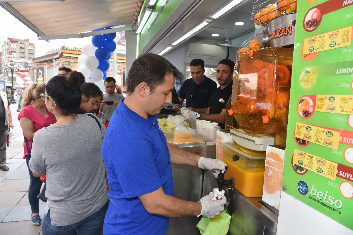 İkram edilen meyve sularını ayrı ayrı tadan ve memnuniyetini yetkililere ileten Kemal Yüce, şunları söyledi: “Eskiden çok tüketirdim. Buradan satın alıp evimde misafirlerime ikram ederdim. Meyve suları gözümüzün önünde yapılıyor güven içinde tüketiyorum. Başkan Yavaş’a bu uygulamayı tekrar başlattığı için teşekkür ediyoruz.” BELKO Vitamin Büfeleri’nde; 250 cc portakal suyu, havuç suyu ve nar suyu 3 TL, limonata 2 lira 50 kuruş, vişne suyu 2 lira 50 kuruş’tan satışa sunuldu.