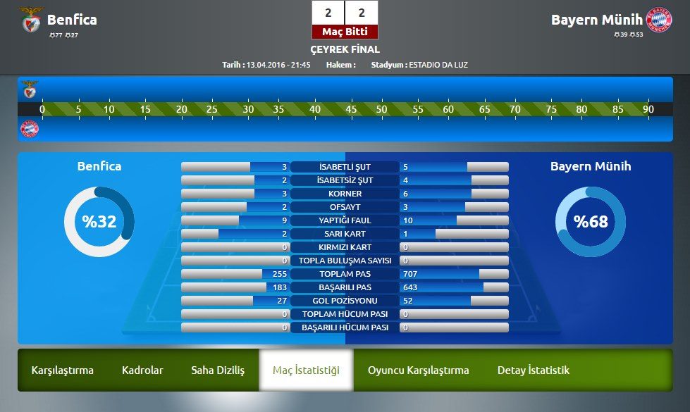 İlk maçta çok iyi oynamamasına rağmen 1-0 yenilen Benfica, Portekiz’deki maça hızlı başladı ilk yarının büyük bölümünde oyunun hakimiydi. Golü de 27. dakikada Jimenez ile bulup ikili averajı eşitledi. Ancak ilk maçta Portekiz ekibini üzen Vidal yine sahne alıp 38. dakikada Luz Stadı’nı sessizliğe bürüdü. İlk yarı bu skorla sona ererken, 2. yarıda Müller tipik gollerinden birini atıp Benfica’yı da boş geçmedi ve işi bitirdi. 76. dakikada Talisca’nın harika golüyle sakor 2-2’ye geldi. Karşılaşma da bu gollerle 2-2 sona erdi ve Bayern yarı finale yükselen ekip oldu.