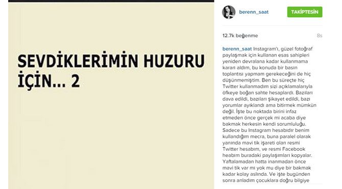 Instagram'ı, güzel fotoğraf paylaşmak için kullanan esas sahipleri yeniden devralana kadar kullanmama kararı aldım, bu konuda bir basın toplantısı yapmam gerekeceğini de hiç düşünmemiştim. Ben bu süreçte hiç Twitter kullanmadım sizi açıklamalarıyla öfkeye boğan sahte hesaplardı. Bazıları dava edildi, bazıları şikayet edildi, bazı yorumlar ayıklandı ama bitirmek mümkün değil. İşte bu noktada birini infaz etmeden önce gerçek mi acaba diye bakmak herkesin kendi sorumluluğu. Sadece bu Instagram hesabıdır benim kullandığım mecra, buna paralel olarak yanında mavi tik işareti olan resmi Twitter hesabım, ve resmi Facebook heabım buradaki paylaşımları kopyalar. Yaftalamadan hatta inanmadan önce mavi tik var mı yok mu diye bir bakmak kadar kolay aslında. Ve işte bugünden sonra anladım çocuklara doğru bilgiye ulaşmayı öğretmek ne kadar önemli. Bir kaç senedir kullandığımız bir sistem yanlış anlama üzerinden insanları bu kadar bölebiliyorsa teknoloji geliştikçe başımıza neler gelecek. Basın özgürlüğünün neredeyse hiç olmadığı Türkiye'de insanlar haber almak için can havliyle sosyal medyaya sarıldı, bunu çok iyi anlıyorum ama şimdi de tuzağa düştüler. Sahte hesaplar, troller insanları bir sürü yalana inandırıp, öfkelendirip kutuplaştırdı. Bu yaz hakkımda çıkan bir sürü magazin haberi sosyal medyadan birbirini takip edip etmemek üzerinden yapıldı. Gerçekten bu böyle miydi artık? İnsalar sadece beğenilmek veya etraftakilere duyurmak üzerinden mi yaşayacaktı? İnsan ilişkileri buraya indirgenecek ve şimdi de milyonların yaşadığı sosyal medya mahallesinin baskılarına mı maruz kalacaktık? İnsanlar kümeleşip öylesine fanatikleşti ki, demokrasinin unsurlarından biri olması gereken seçim yüzünden, öyle kızdı, öyle nefret etti ki tam da o günlere denk gelen terör eylemlerine karşı durduğunu göstermek için etrafına zarar verip, kendi terörünü yaratmaya başladı. Kimi cam çerçeve kırarak, kimi kavga ederek, hiç bir şey yapamıyorsa sosyal medyadan bir psikolojik terör yaratarak. İşte tam bu noktada benim esas terörist ilan edilme serüvenim başlıyor. Peki ne yaptım? Çirkefleşen sosyal medayı takip etmeyi bıraktım.