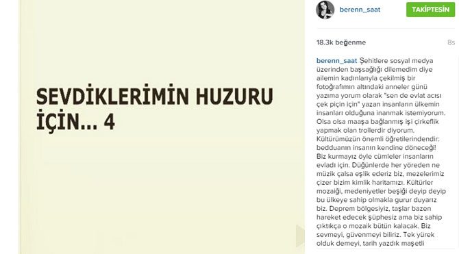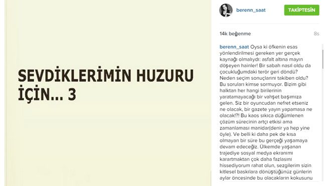 Siyasi açıklamalarıyla gündemde yer alan ünlü oyuncu Beren Saat, Instagram üzerinden siyasi açıklamalarda bulunup, şehitlere başsağlığı dilemediği için eleştirenlere cevap verdi. Sevdiklerimin huzuru için yazan fotoğrafı 4 kez paylaşarak neden sosyal medya üzerinden terörle ilgili açıklama yapmadığın, bir süre sosyal medyayı kullanmayacağını ve bazı sahte hesaplarının mahkemeye verildiğini açıkladı.