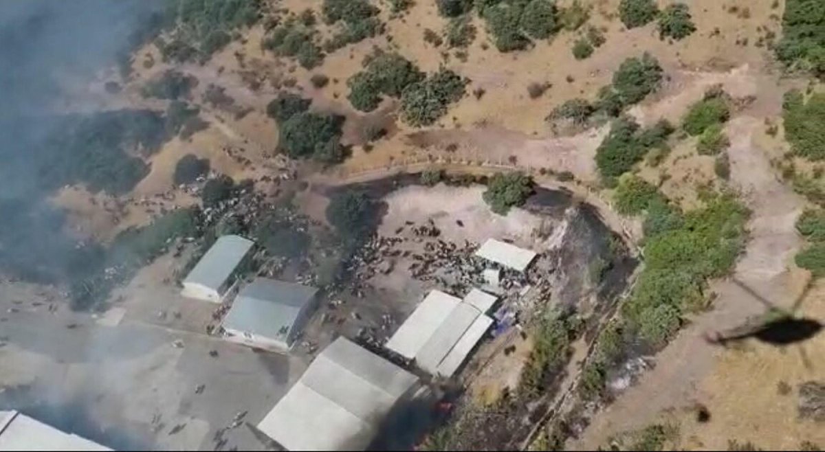 İzmir'in Bergama ilçesinde makilikte başlayan yangında alevler bölgedeki süt fabrikasına sıçradı. Çiftlikteki hayvanlar, tahliye edildi.