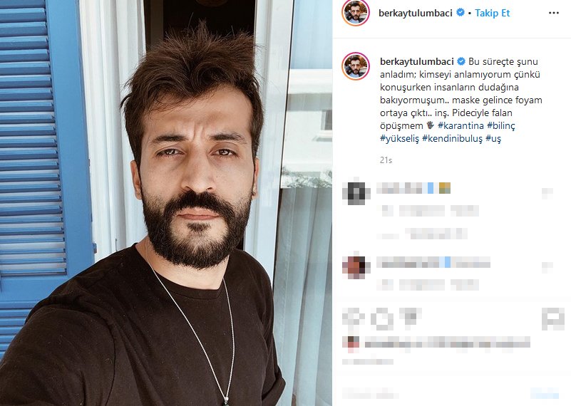 "Bu süreçte şunu anladım; kimseyi anlamıyorum çünkü konuşurken insanların dudağına bakıyormuşum.. maske gelince foyam ortaya çıktı.. inş. Pideciyle falan öpüşmem"